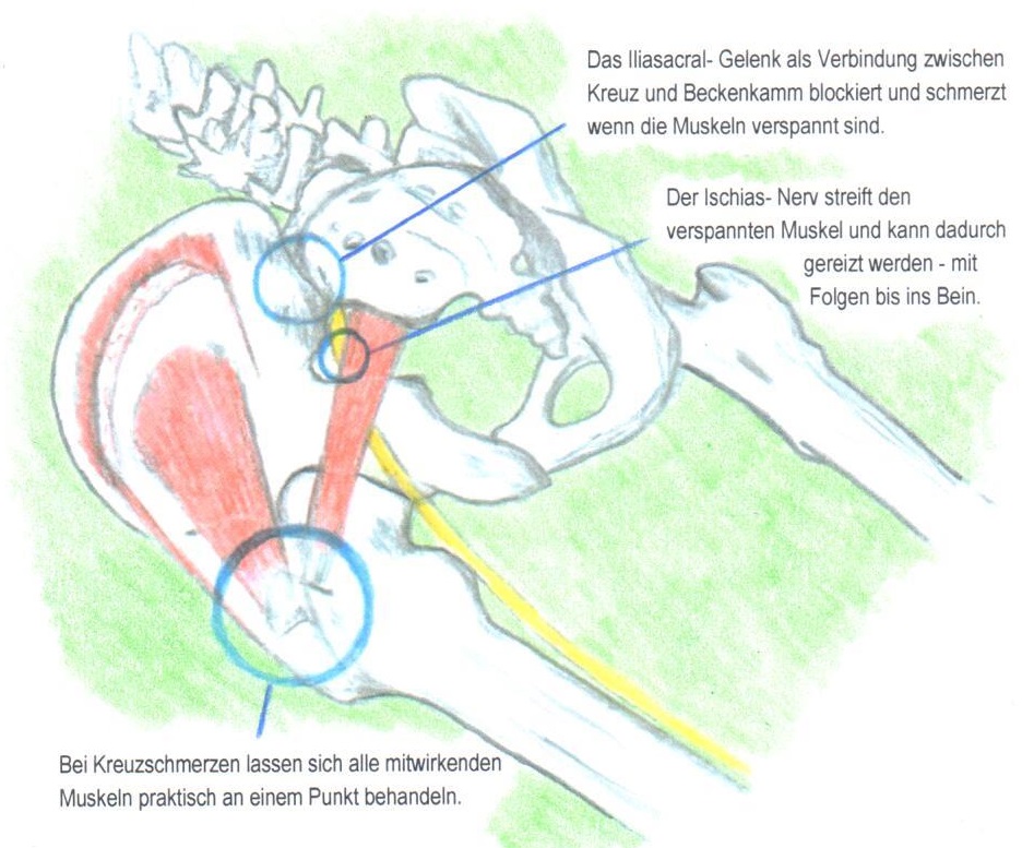 Ein Hexenschuss, auch bekannt unter Lumbago oder ISG- Blockade ist einfach eine sehr starke Verkrampfung von einem kleinen Muskel im Gesäss. Dieser Muskel quert in der Bewegung den Ischiasnerv, der die Beine mit Kraft versorgt. Ein Hexenschuss ist für den Körper ein geniales Mittel als Notstop.
