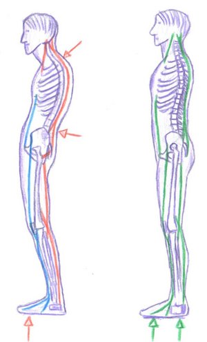 Diese Körperhaltung treffe ich immer wieder an in meiner Praxis. Die roten Pfeile zeigen die klassischen Schmerzorte. Der Ursprung dieser Rückenschmerzen liegt aber bei den allermeisten Personen bei den Füssen. Grund: Mehr Gewicht auf den Zehen und weniger auf den Fersen. Dadurch wird das Becken nach vorne verschoben. Die Wirbelsäule muss die Körperhaltung nach hinten ausgleichen. Rückenschmerzen entstehen, weil die Rückenmuskeln unter Dauerbelastung arbeiten muss, weil man sonst nach vorne kippen würde.